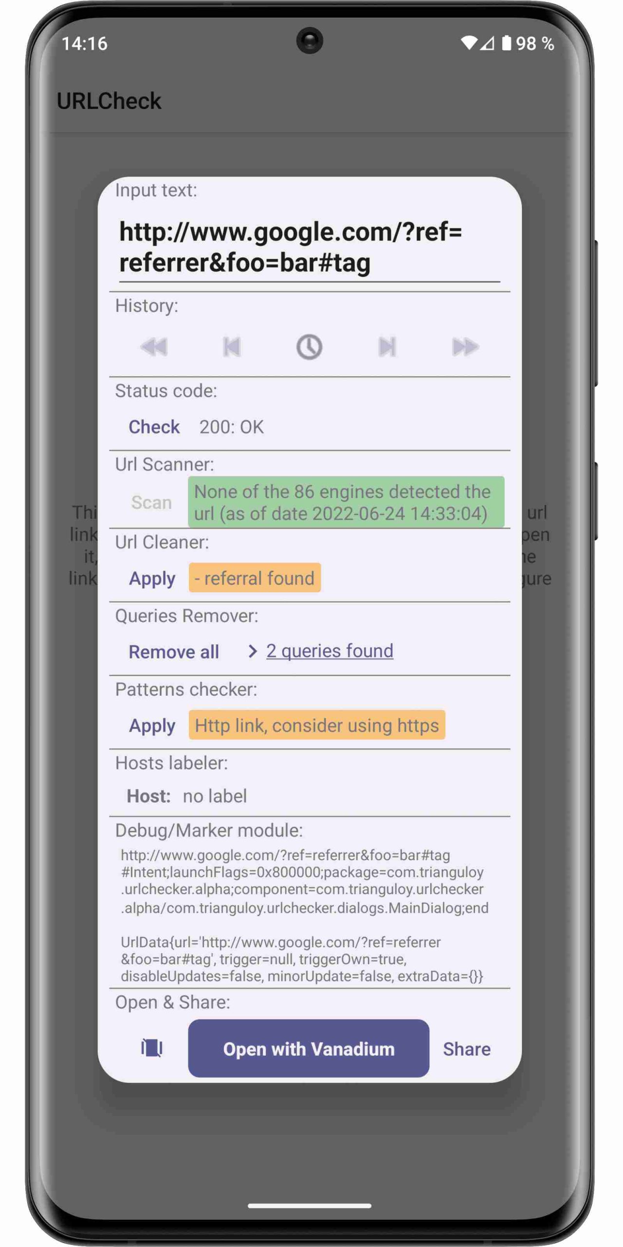 Jej názov je URLCheck a slúži ako prostredník medzi odkazom a prehliadačom. Za bežných okolností na akýkoľvek internetový odkaz ťuknete, otvorí sa buď internetový prehliadač alebo preddefinovaná aplikácia. Po nainštalovaní a sprístupnení URLCheck aktivuje skener, ktorý zachytí každý odkaz a najprv vám ponúkne možnosti, čo s ním chcete ďalej urobiť.
