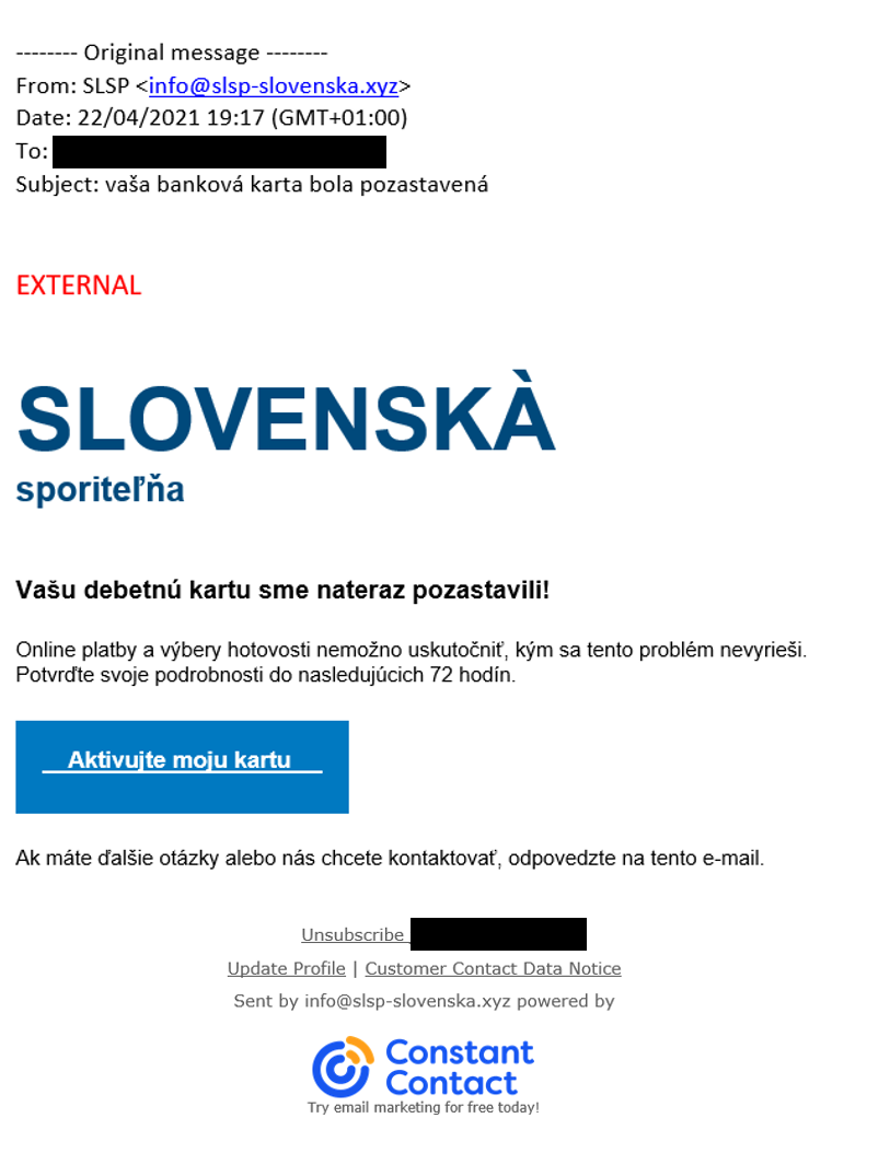 Tento týždeň bola zaznamenaná aj phishingová kampaň zameraná na klientov Slovenskej sporiteľne. Zákazníci môžu dostať podvodný e-mail, ktorý ich upozorňuje na zablokovanie platobnej karty, aj keď nepôsobí veľmi presvedčivo. Najmä kontaktné údaje v pätičke mailu a pozmenené logo Slovenskej sporiteľne vzbudzuje podozrenie. To sa však zmení po kliknutí na odkaz, ktorý vedie na uveriteľnejší prihlasovací formulár do internet bankingu. Tu je potrebné zvýšiť obozretnosť. Banky totiž nežiadajú o prihlasovacie ani osobné údaje prostredníctvom e-mailu. Banky totiž nežiadajú o prihlasovacie ani osobné údaje prostredníctvom e-mailu. Pokiaľ si nie ste istý, či ide ide o skutočnú alebo podvodnú komunikáciu, radšej do vašej banky priamo zavolajte a overte si, či sú informácie v e-maile pravdivé. Nejde pritom o ojedinelý prípad phishingovej kampane z posledného obdobia. Len pred mesiacom upozorňovala svojich klientov na phishingové útoky Tatra banka, ktoré rovnako prebiehali cez falošný prihlasovací formulár. Buďte opatrní a overujte si všetky informácie, ktoré dostanete nevyžiadane alebo vzbudzujú čo i len malé podozrenie. Pred podobnými útokmi vás dokáže ochrániť aj vhodný bezpečnostný softvér. Zdroj: EsetPodobné články