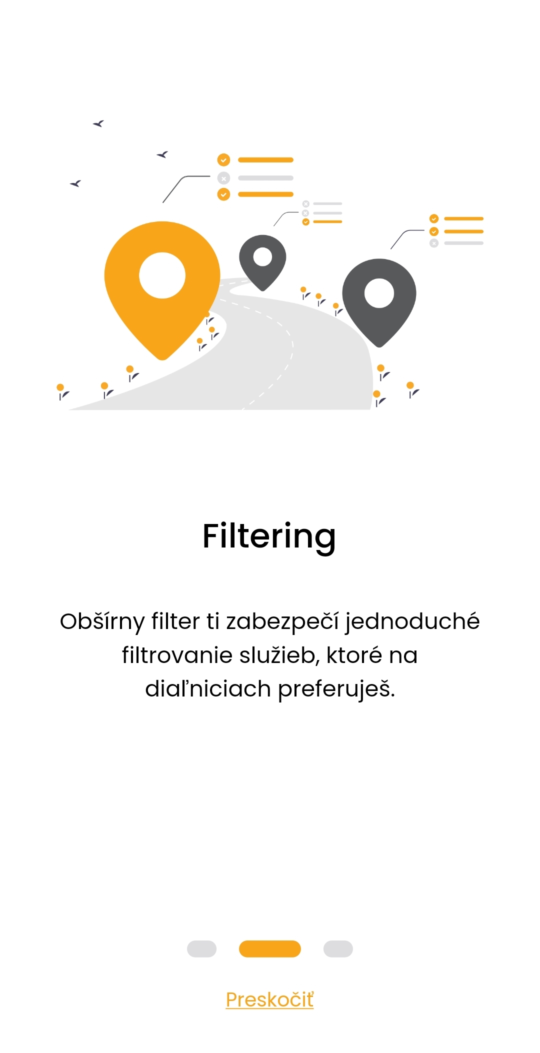 Mobilná aplikácia informuje o službách na diaľničných odpočívadlách, ponúka možnosť náhľadu na odpočívadlo a navigáciu na dané odpočívadlo. Podrobný filter ponúka výber konkrétnych služieb, ktoré na odpočívadlách preferujete. V súlade s tým sa totiž na mape zobrazia len tie, ktoré preferujete.