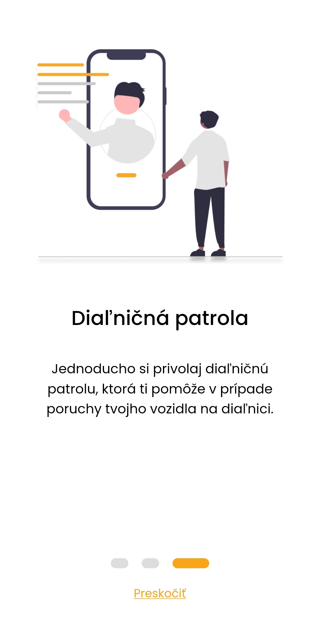 Princíp zavolania Diaľničnej patroly v núdzovej situácii je podobný ako v aplikácii Pomoc na diaľnici. Pomoc si môžete zavolať jedným klikom napríklad pri poruche vozidla. Patroláci najčastejšie pomáhajú motoristom vytvorením bezpečného zákrytu. Okrem tejto funkcie však aplikácia ponúkne aj mnoho ďalších užitočných informácií.