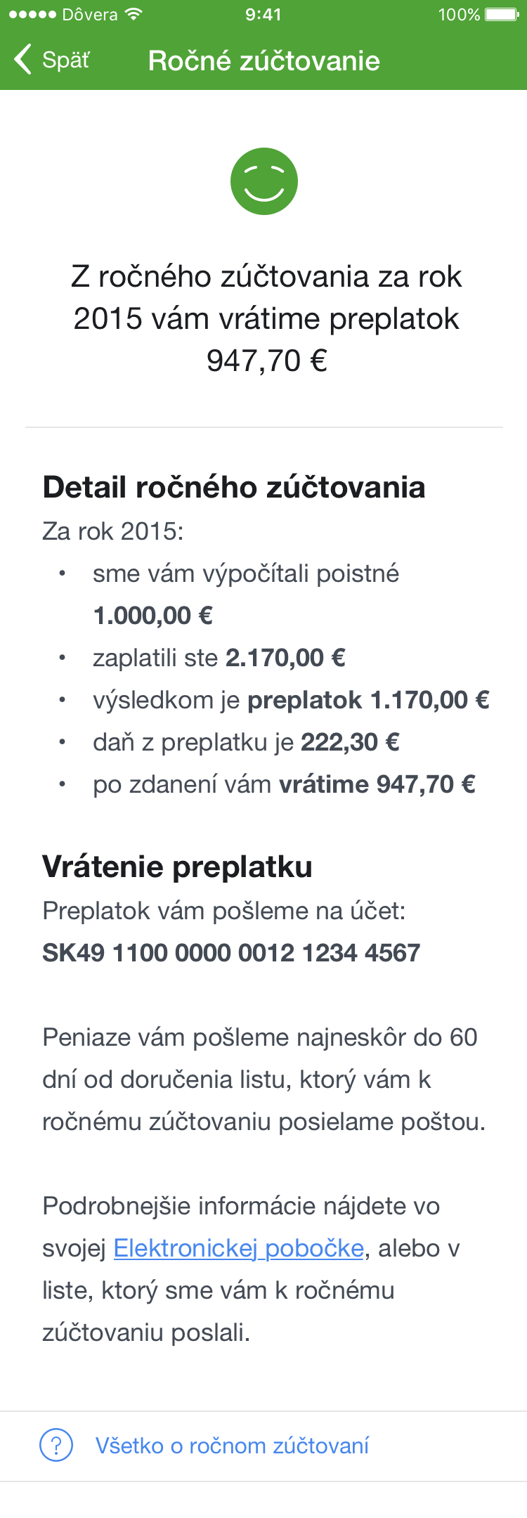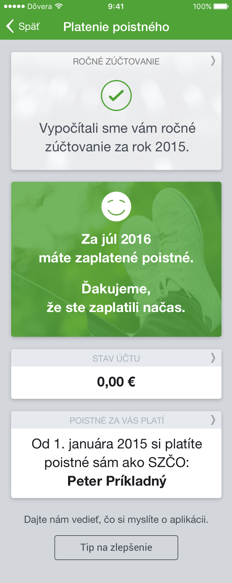 O nových vlastnostiach tejto aplikácie sme sa priamo v poisťovni rozprávali s Petrom Melušom, ktorý je produktovým manažérom v Dôvere. S ním sme pripravili aj video, ktoré názorne ukazuje možnosti vynovenej aplikácie a odpovedá na to, ako pomáha táto aplikácia podnikateľom a živnostníkom. Už od začiatku poskytuje aplikácia Dôvera kartičku poistenca, ale aj prehľad užívaných liekov, vyšetrení a diagnóz ako aj prehľad zdravotníckych zariadení na aktuálnom mieste. Teraz však aplikácia Dôvera obsahuje aj účty platiteľov poistného pre tých poistencov, ktorí si sami platia zdravotné odvody – teda SZČO a živnostníkov. Podnikatelia a živnostníci tak majú presný prehľad o tom, koľko, za čo a dokedy je potrebné zaplatiť a to priamo v aplikácii. Aktuálne informácie o stave svojho účtu v zdravotnej poisťovni majú vždy k dispozícii. O tom, v akom stave je ich účet informuje ikona so symbolom €. Pokiaľ je nad týmto symbolom biela bodka, znamená to, že je pre vás k dispozícii informácia, ktorú by ste si mali prečítať. Ak je táto bodka červená, znamená to, že máte dlh a je pre vás výhodné na túto situáciu reagovať.
