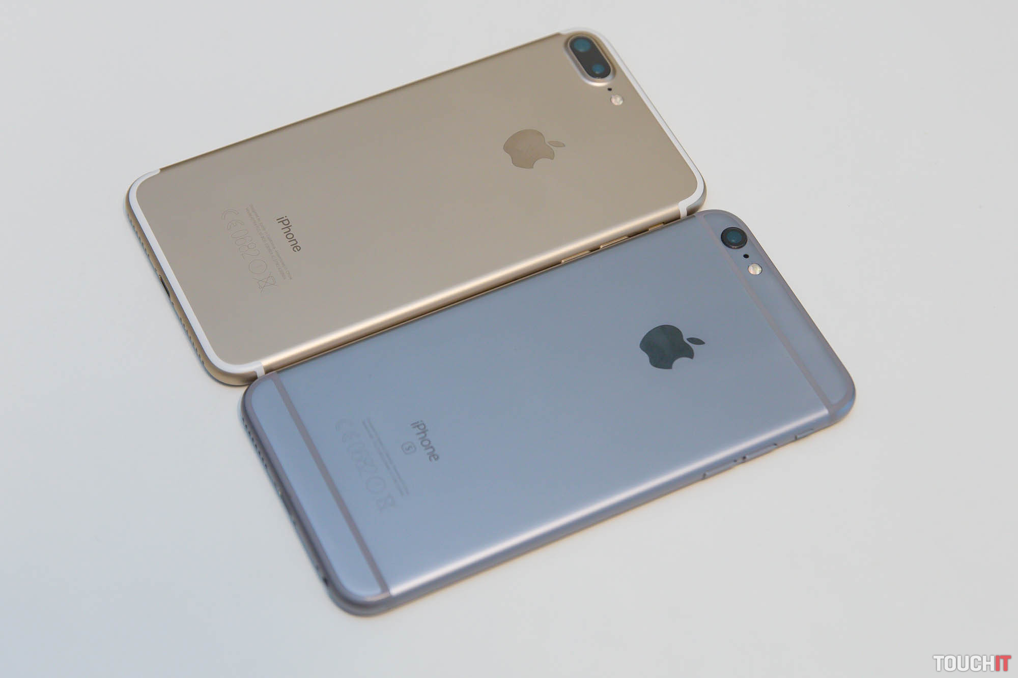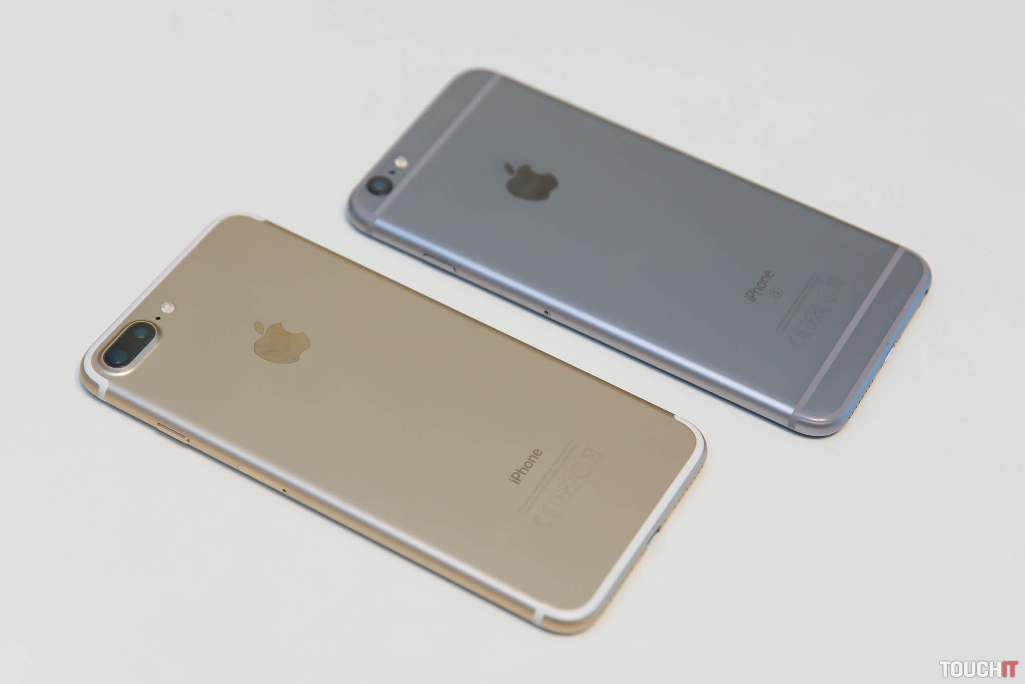 Porovnanie iPhonu 7 Plus (vľavo) s rok starým iPhonom 6s Plus (vpravo). Všimnite si iné fotoaparáty, chýbajúci 3,5 mm jack a iné pásiky od antén. Iné sú aj tlačidlá Domov, hoci vyzerajú takmer identicky