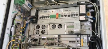 3 časti každej základňovej stanice. Zľava anténa, Remote Radio Unit a Base Band Unit