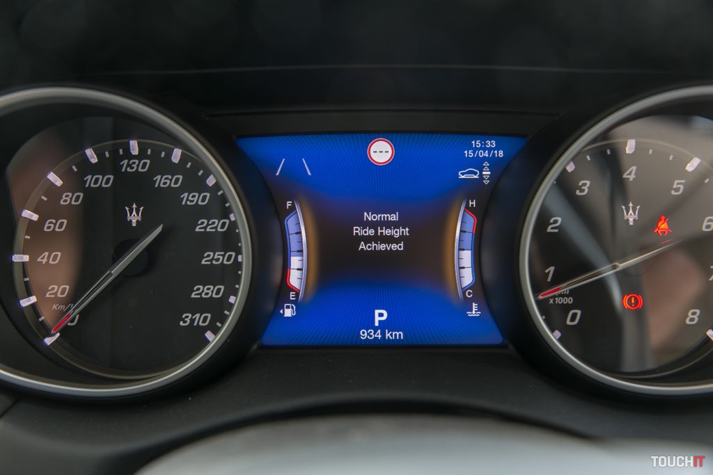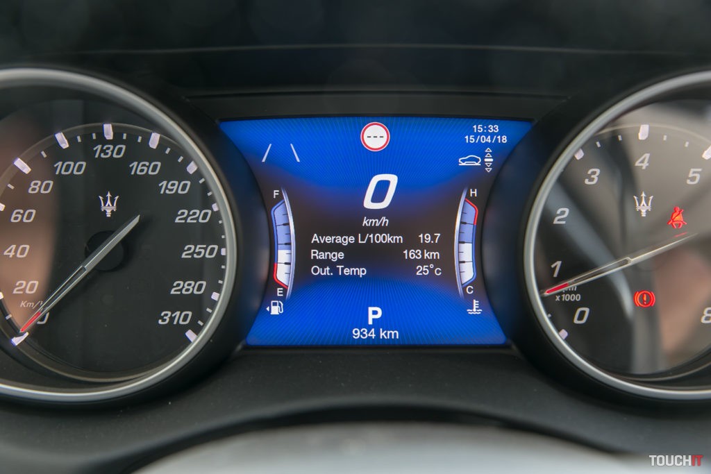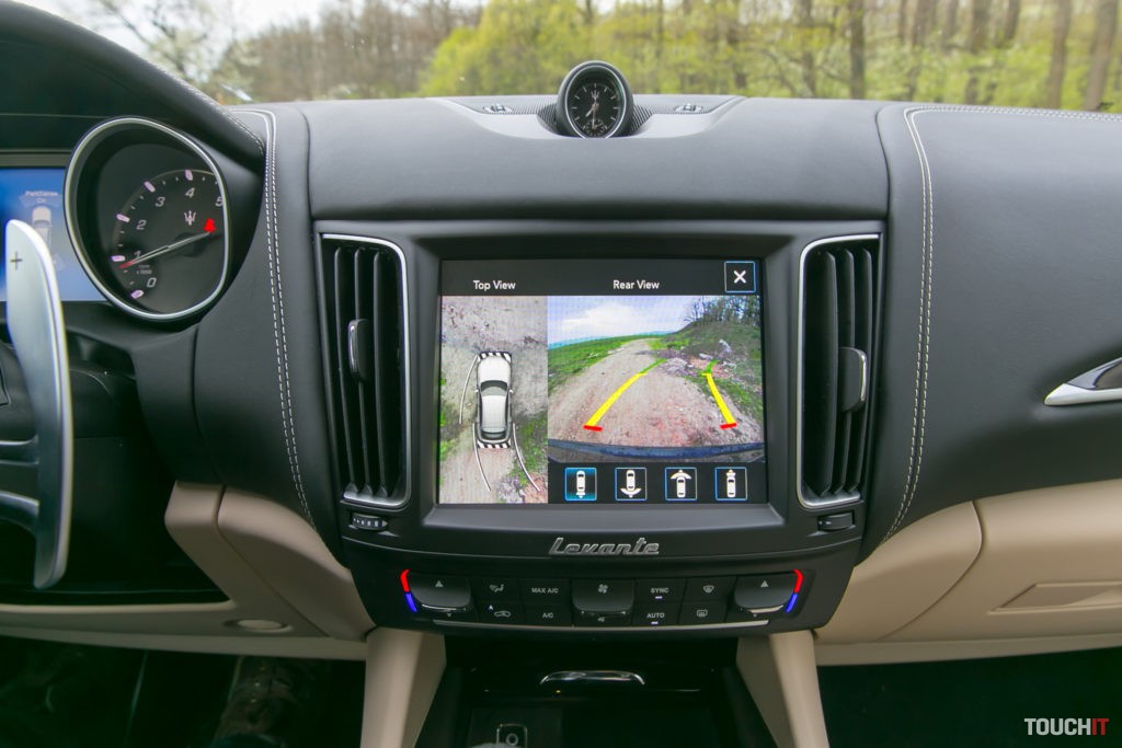 Dotykový displej na palubnej doske je farebný a výborným kontrastom. Dá sa prispôsobiť v tom smere, že si dôležité ikony presuniete do spodného riadku. Žiaľ, nedajú sa meniť pozície ikon na samotnom displeji. Ale na dotyk reaguje pružne a na ihneď. Samozrejme máte aj 360° pohľad okolo auta a parkovacie senzory. Škrabance pi cúvaní by tak nemali nastať, ale je pravda, že parkovať s Maserati Levante S v podzemnej bratislavskej garáži si vyžaduje celkom zručnosť.