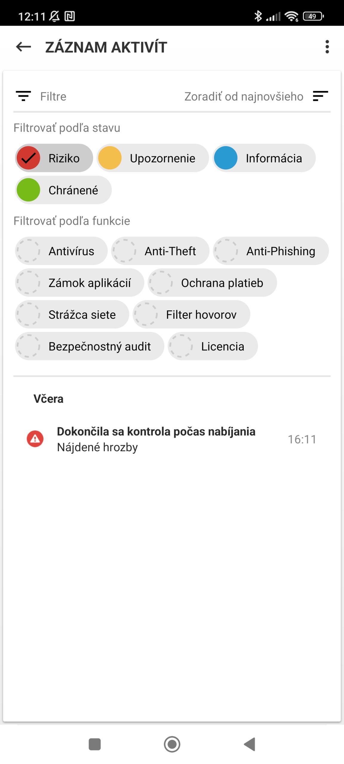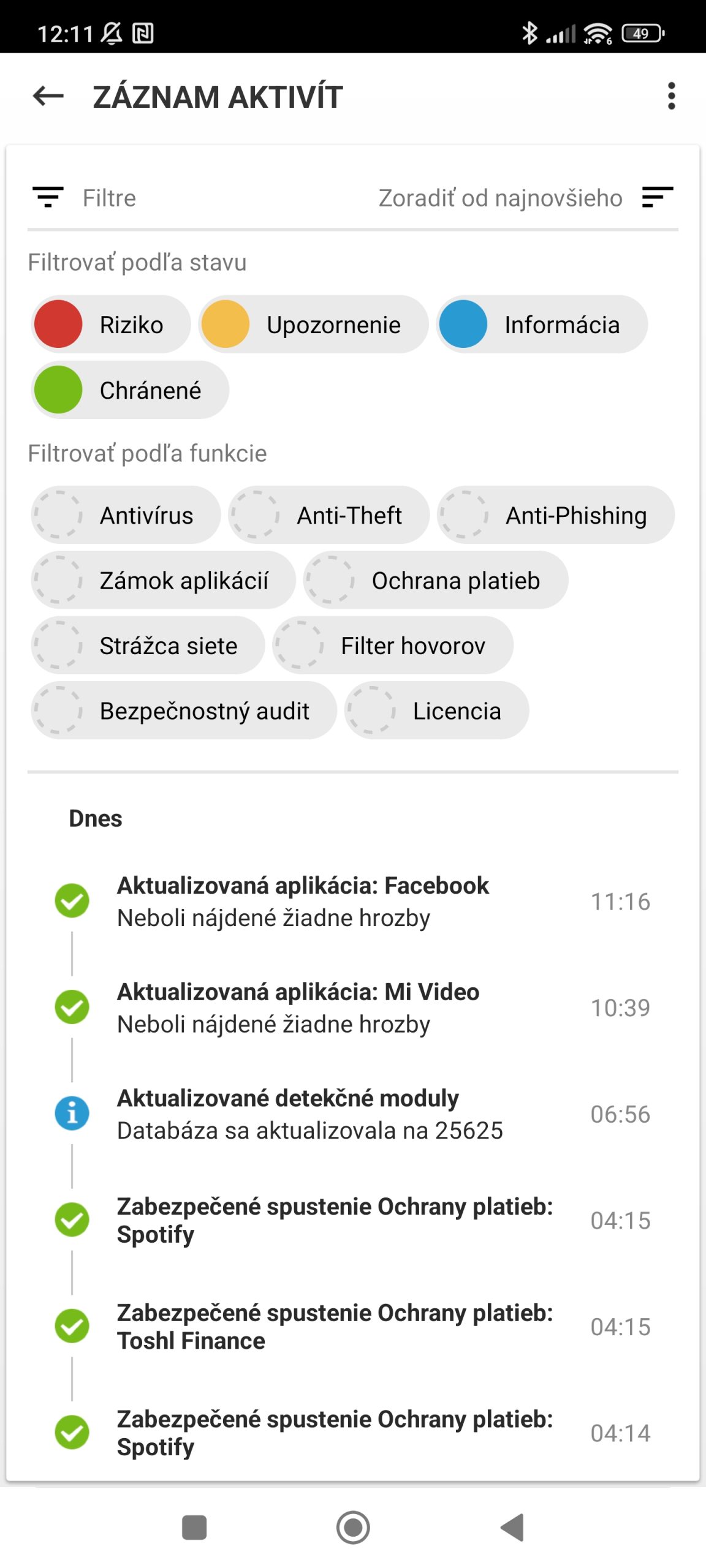 Zo záznamu programu o jeho aktivitách je vidno, že do kontroly Ochrana platieb pridal nielen Toshl Finance ale aj Spotify. Je to pravdepodobne prvotná kontrola, aplikácie nie sú zaradené v trvalom zozname s ďalšou ochrannou vrstvou po spustení, ako napríklad bankové aplikácie.