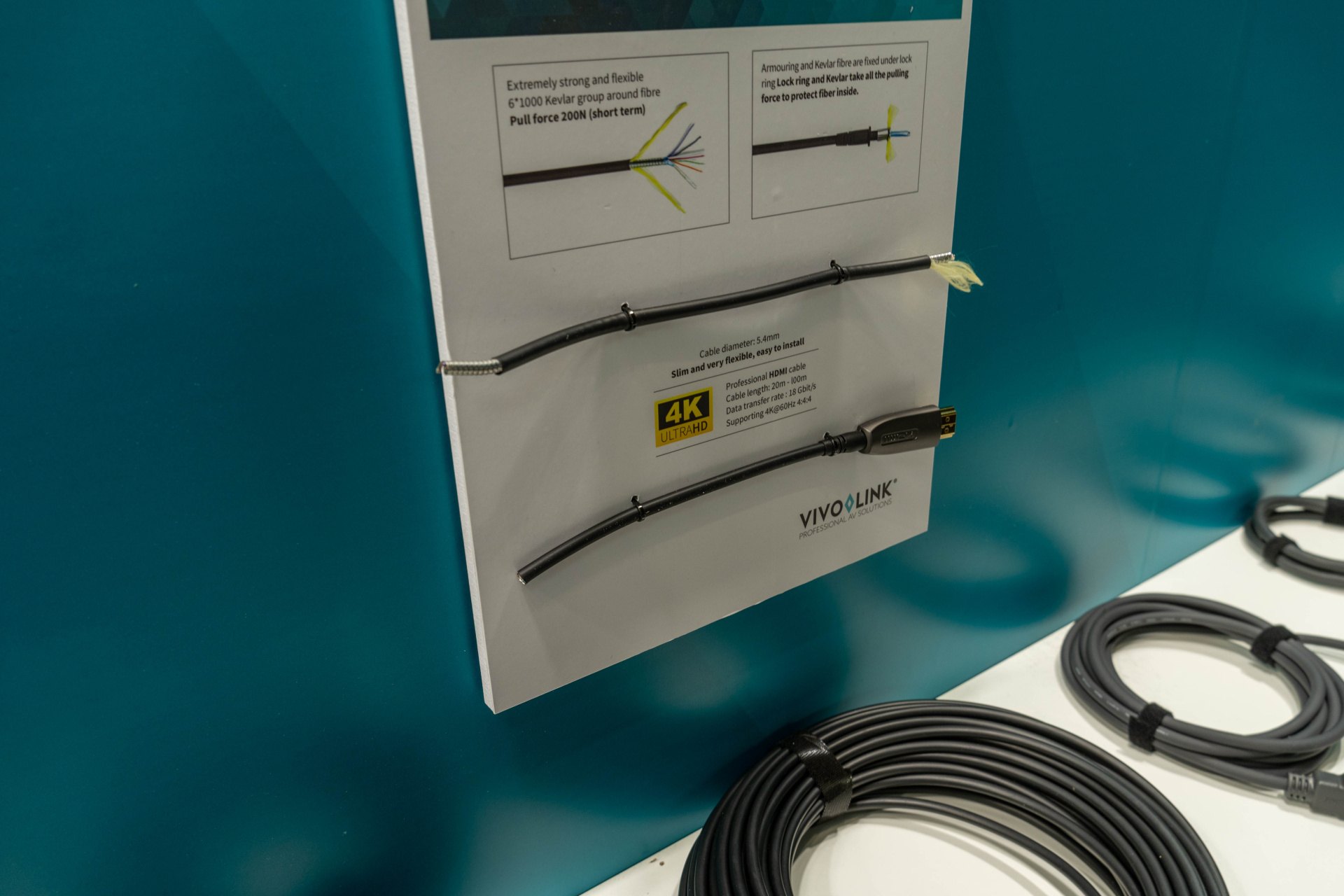 Spoločnosť Vivolink je jedným z popredných dodávateľov mimoriadne dlhých káblov USB. Pritom si tieto káble zachovávajú kvalitu prenosu obrazu aj v ultravysokom rozlíšení (napr. 8K/Ultra HD). Vyznačujú sa tiež vysokou pevnosťou, pričom ich pevnosť v ťahu dosahuje až 30 kg. Priamo na ISE sa táto vlastnosť aj dala otestovať.