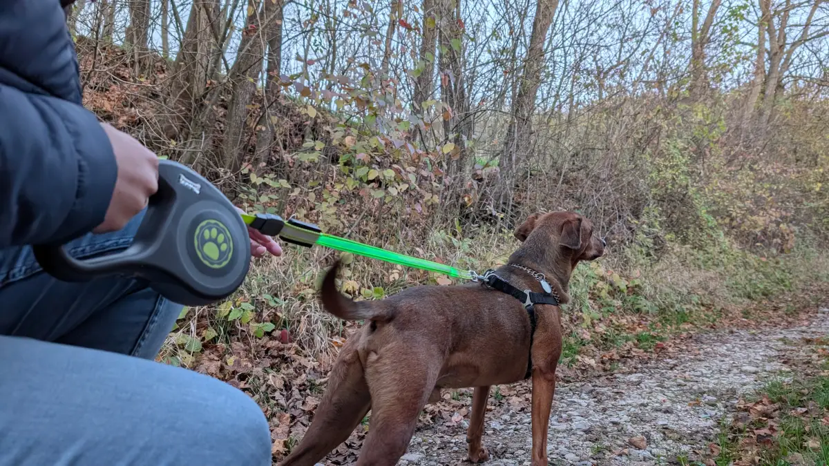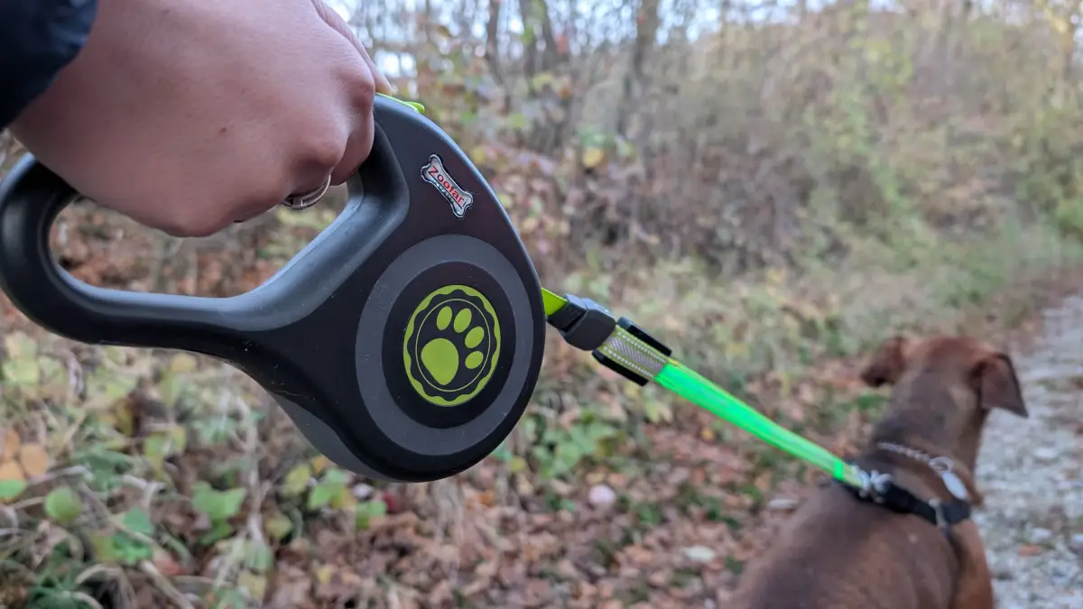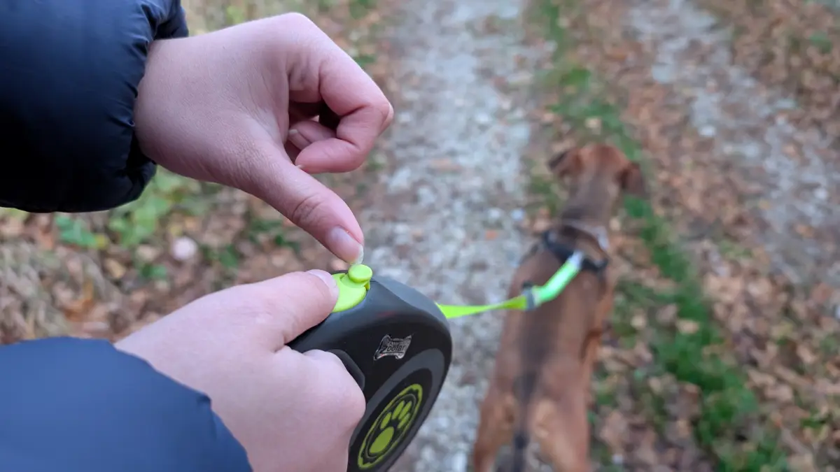 Vôdzka Zoofari je navíjacia, čo môže pre niektorých majiteľov psíkov znamenať vyšší komfort. Ja som v prípade svojho psa zvyknutá skôr na vôdzku bez navijaka, pri používaní LED vôdzky Zoofari som sa však cítila komfortnejšie, ako som očakávala. Navijak funguje spoľahlivo, ak chcete vôdzku pozastaviť, stlačíte len tlačidlo. Občas sa mi pri používaní stalo, že po stlačení zastavovacieho tlačidla sa aktivovalo aj aretačné tlačidlo a po jeho uvoľnení sa navíjanie nespustilo. Celkový zážitok z používania vôdzky mi to však nepokazilo. Maximálna dĺžka vôdzky je 5 metrov.