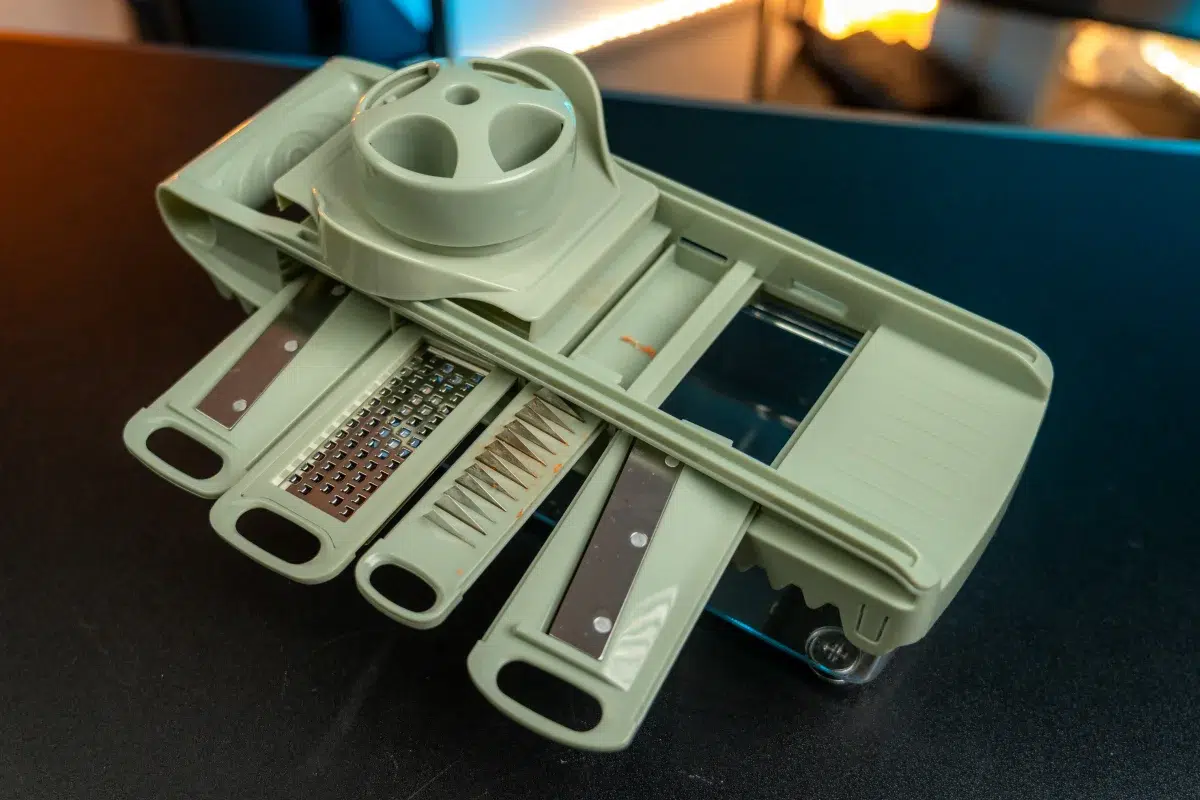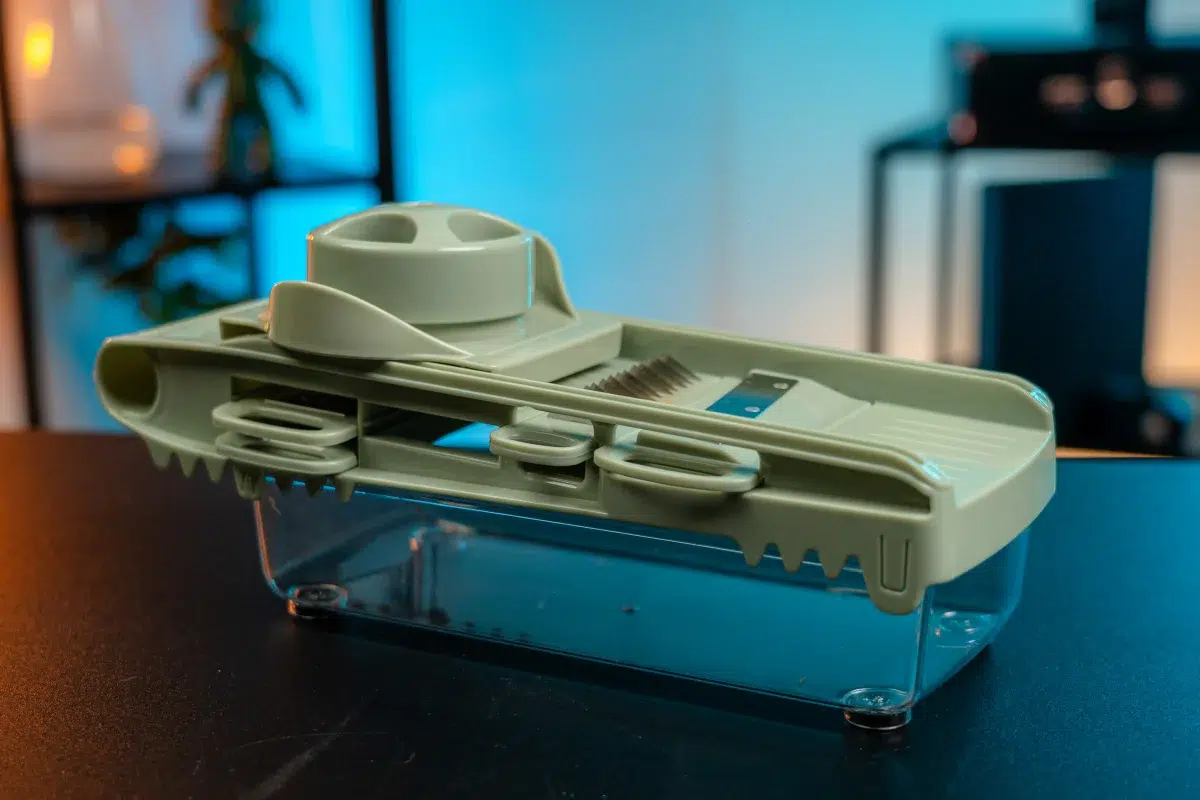 Strúhadlo sa predáva v dvoch variantoch, s 4 alebo 5 nadstavcami, pričom všetky nadstavce majú svoje odkladacie miesto priamo v tele strúhadla, čo zjednodušuje jeho skladovanie. Keďže ide o manuálne strúhadlo, nepotrebujete žiadne elektrické pripojenia a dobre poslúži na krájanie či strúhanie rôznych druhov ovocia, zeleniny či syra.