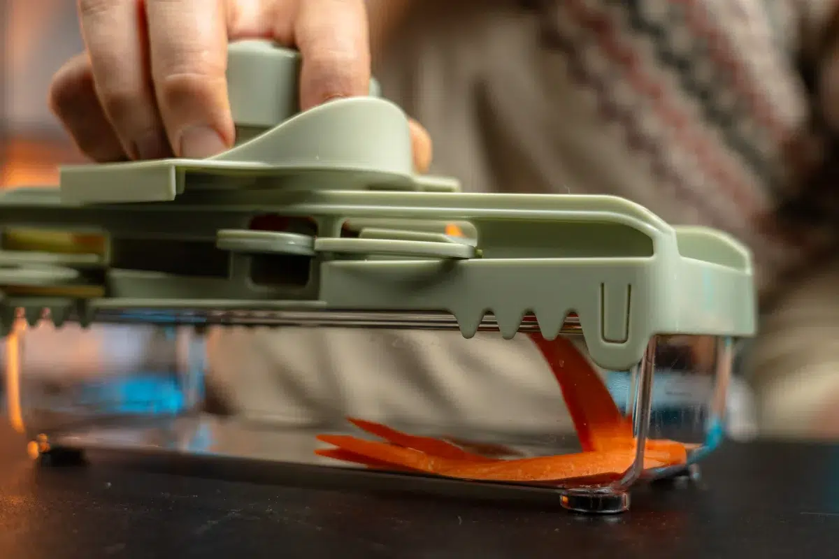 Tento malý kuchynský pomocník prichádza s nadstavcami z nehrdzavejúcej ocele, ktoré zvládnu hrubé aj jemné strúhanie či krájanie na plátky, rezance. Strúhadlo je vyrobené z plastu, pokrájané suroviny sa zbierajú v miske, ktorá má pogumované nožičky, aby celé strúhadlo počas práce s ním pevne držalo.