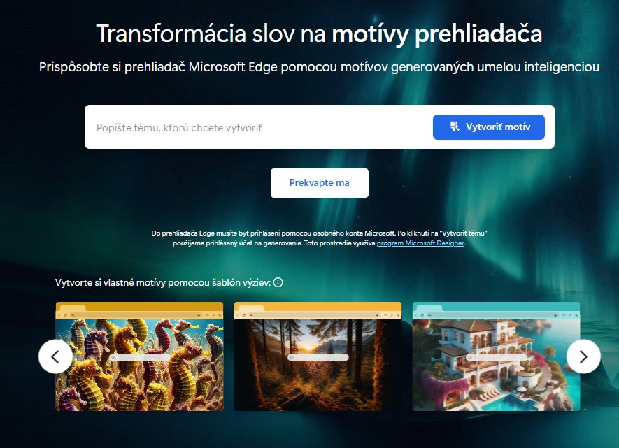 Microsoft ponúka na svojom webe AI funkciu na vytvorenie motívu do svojho prehliadača Edge. Funguje na princípe generovania cez AI a mení sa farebný vizuál prvkov a pozadie novej karty. Nie je to nástroj na detailné vytvorenie témy, no ako inšpiratívny základ môže poslúžiť. Okrem toho máte na výber z vytvorených motívov, ktoré pred vami pripravil niekto iný.