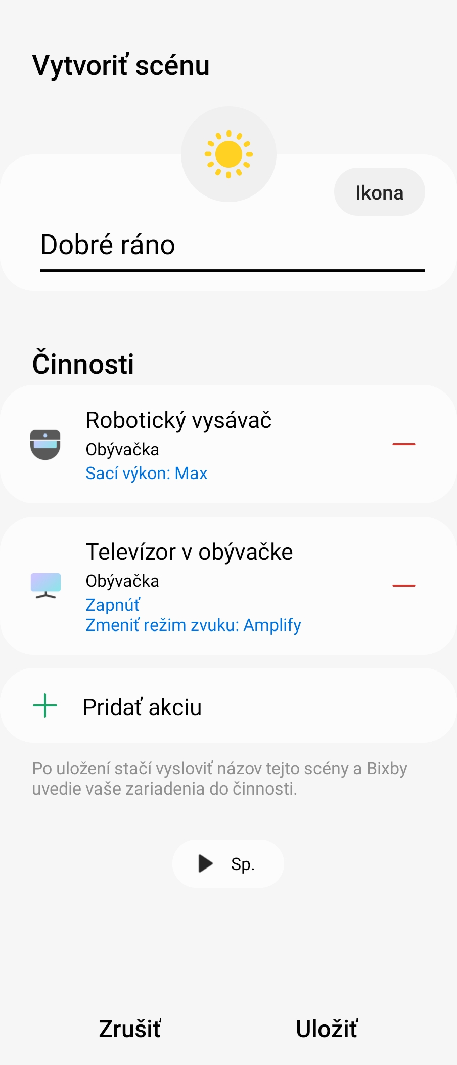 Toto je jedna z výborných funkcií systému SmartThings a pritom veľa ľudí o nej nevie. V aplikácii SmartThings ich nájdete v záložke Automatizácia. Scéna funguje na princípe automatizácie viacerých činností. Napr. nech je ráno a vtedy spustíte čističku vzduchu, robotický vysávač a zapnete televízor a to so silnejším zvukom. Toto všetko si viete naprogramovať ako scénu napr. s názvom Dobré ráno.
