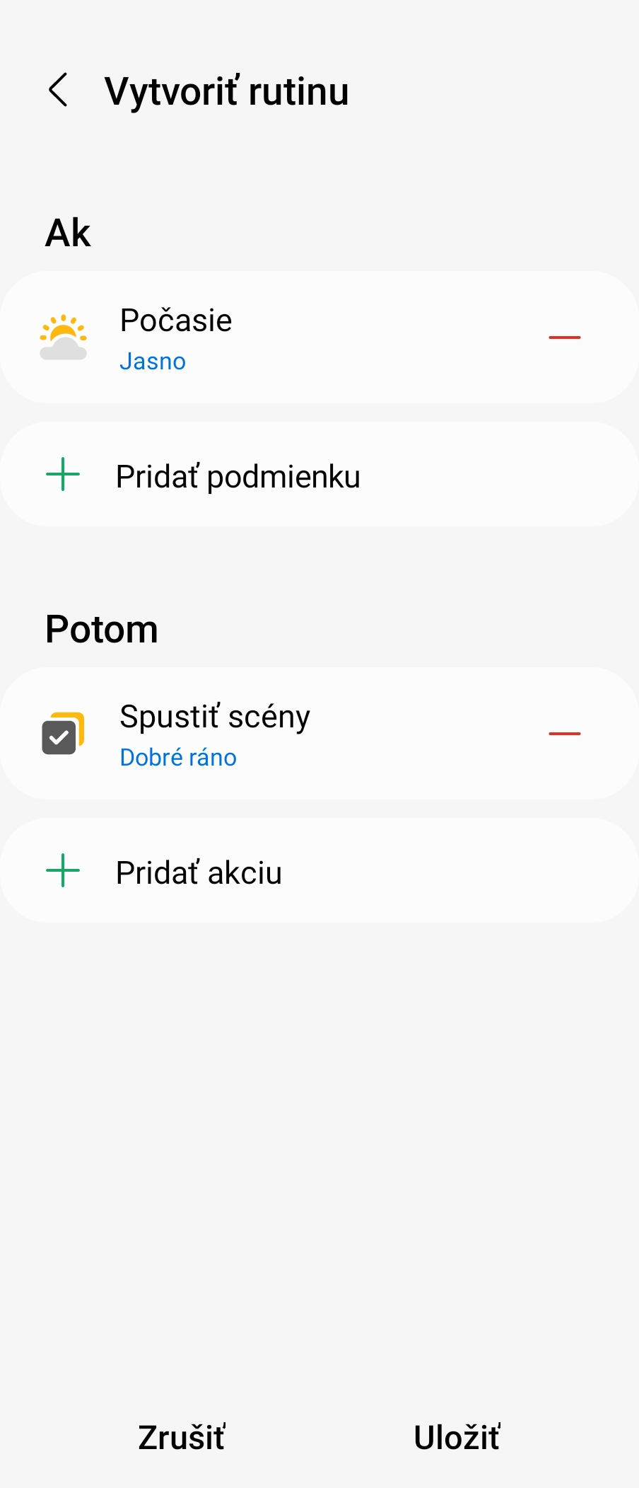 Rutina je niečo trochu iné. Vychádza z myšlienky – Ak sa niečo stane, potom vykonaj toto. Podmienka Ak môže vychádzať napr. aj z aktuálneho počasia, resp. jeho predpovedi cez Weather channnel. Ak je jasno, potom sa trebárs spustí zavlažovanie alebo spustí celú scénu Dobré ráno, ktorú sme si vytvorili vyššie.