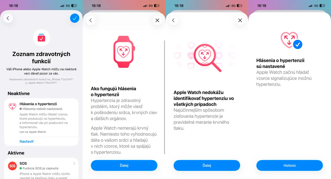 watchOS 26 prináša aj ďalšiu novú zdravotnú funkciu – Hlásenia o hypertenzii. Táto funkcia vás upozorní na stav vysokého krvného tlaku. Dostupná je pre Apple Watch Series 9 a novšie a Apple Watch Ultra 2 a novšie. Funkcia je dostupná už aj na Slovensku a po aktualizácii na systémy iOS 26 a watchOS 26 si ju musíte manuálne aktivovať v aplikácii Zdravie v iPhone.