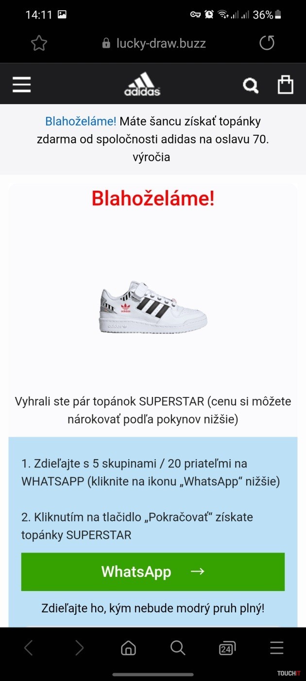 sa pritom stačí zúčastniť “ obyčajného losovania„. Pre vyvolanie väčšieho napätia je po otvorení stránky dokonca spustená časomiera, ktorá má prinútiť používateľa ihneď konať. Po istej výhre sa zobrazí oznam o potrebe jej zdieľania prostredníctvom WhatsAppu, aby ste si na údajnú výhru mohli nárokovať. Nárokovanie výhry je podľa popisu prinajmenšom zvláštne. O podozrivom pôvode stránky napovedá aj čierny riadok s logom Adidas, v ktorom sú všetky položky nefunkčné. To znamená, že sa nedostanete do ponuky, košíka a ani nedokážete použiť vyhľadávanie. Odporúčame preto na tieto a podobné linky neklikať a nezdieľať ich.