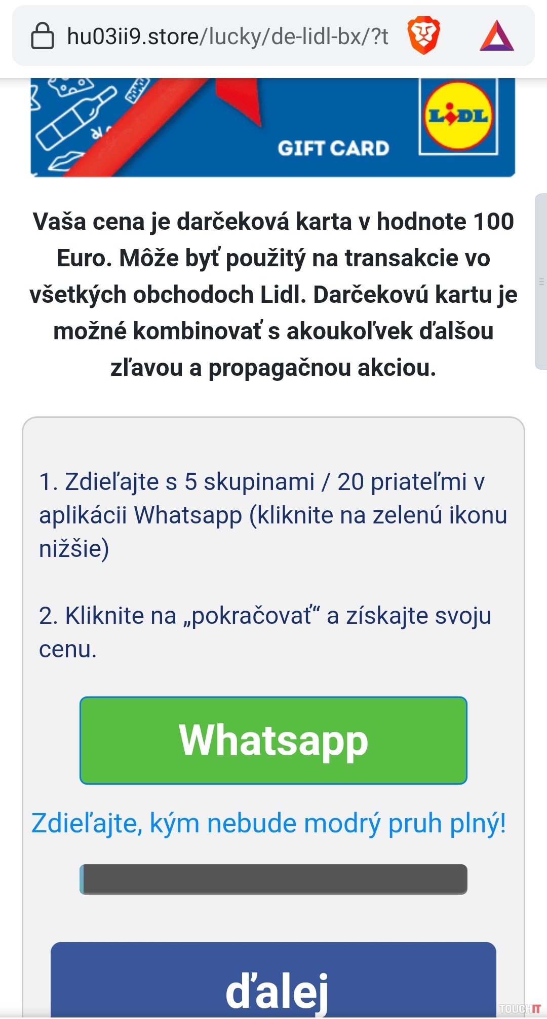 Nie je tu žiadna spojitosť, no WhatsApp ako úspešná a najmä teda rozšírená platforma na komunikáciu, zvyšuje šancu podvodníkov. O to viac, že správa vám príde z vami uloženého kontaktu. Nie je tu žiadny preklep, ani chyba, skrátka kontakt vám niečo zazdieľa. Podobne ako pri fotografiách alebo preposielaných linkoch. Na pohľad by sa mohlo javiť, že bude ťažšie identifikovať správu ako podvod, no v tomto smere je vám WhatsApp nápomocný. Ten totiž zobrazuje zároveň link, kam odkaz pod správou vedie. Teda ťuknutím ste boli oboznámený, že cieľový web nebude ten, ktorý patrí Lidlu. Po ťuknutí na link sa zobrazí stránka s možnosťou vyhrať darčekovú poukážku. V našom prípade sme na tretí pokus objavili v jednom balíčku takúto poukážku. Na to, aby ste ju podľa slov tohto podvodu získali, je treba informáciu o tejto súťaži preposlať ďalej a to pred uplynutím časového limitu. Na ten vás stránka upozorňuje. Odoslať treba na 5 skupín alebo 20 priateľov. Vyskúšali sme to dvakrát a v oboch prípadoch sa potvrdila výhra až na tretí pokus. Na spodku stránky sú aj komentáre, falošné. To ak by ste mali pochybnosti, že vyhrať môže každý a je to podvod. Komentáre informujú o tom, že niektorí nič nevyhrali. To vás má utvrdiť v tom, že je to pravé a vaša výhra nie je naprogramovaná.