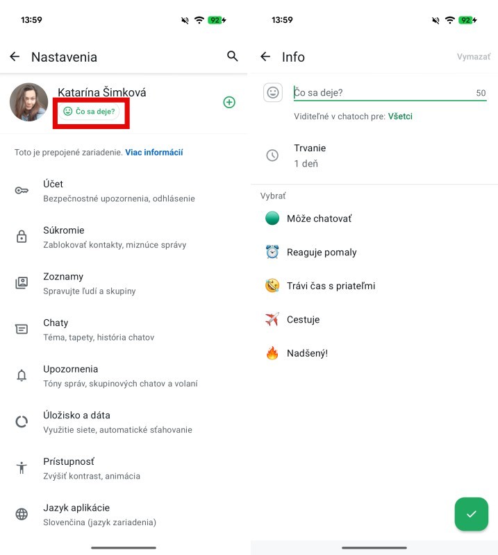 Sekcia Info pritom bola v minulosti populárnou súčasťou platformy WhatsApp, teraz ale prichádza v novom šate. Pripomínať tak bude poznámky na Instagrame, ktorými sa bezpochyby inšpirovala. Vašu správu si jednoducho nastavíte v nastaveniach vášho WhatsAppu, pričom pod vaším menom sa zobrazuje prvok s nápisom „Čo sa deje?„. Do tohto Prvku jednoducho zadáte vašu správu a vyberiete si k nemu emoji.