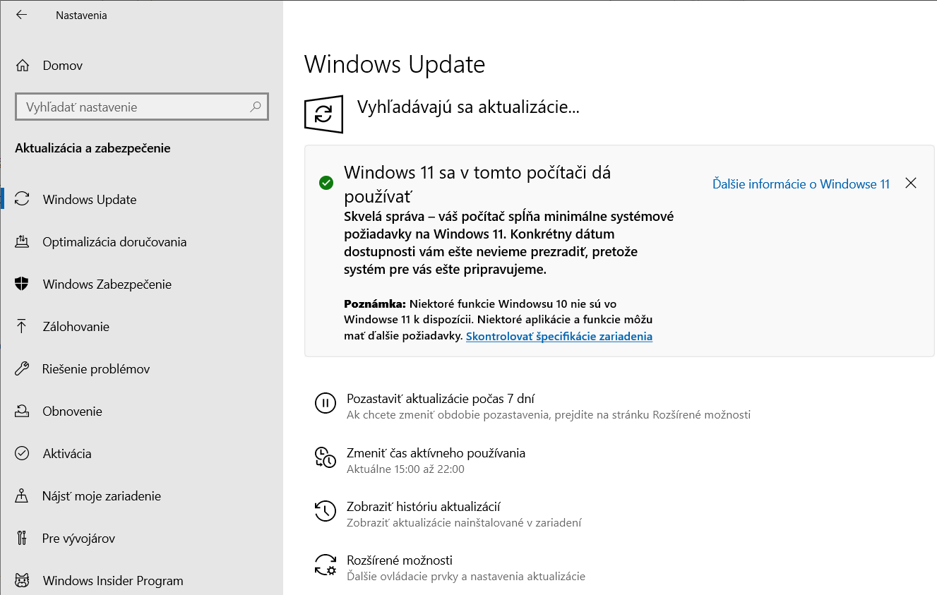 Späť k aktualizácii. Na zistenie pripravenosti inštalačného balíka pre váš počítač kliknite na modrý text s názvom Skontrolovať špecifikácie zariadenia. V prípade dostupnosti systému sa objaví možnosť stiahnuť ho a nainštalovať. Proces je automatický, s počítačom môžete naďalej pracovať. Dáta v princípe zálohovať netreba, no je istejšie, ak si zálohu urobíte.
