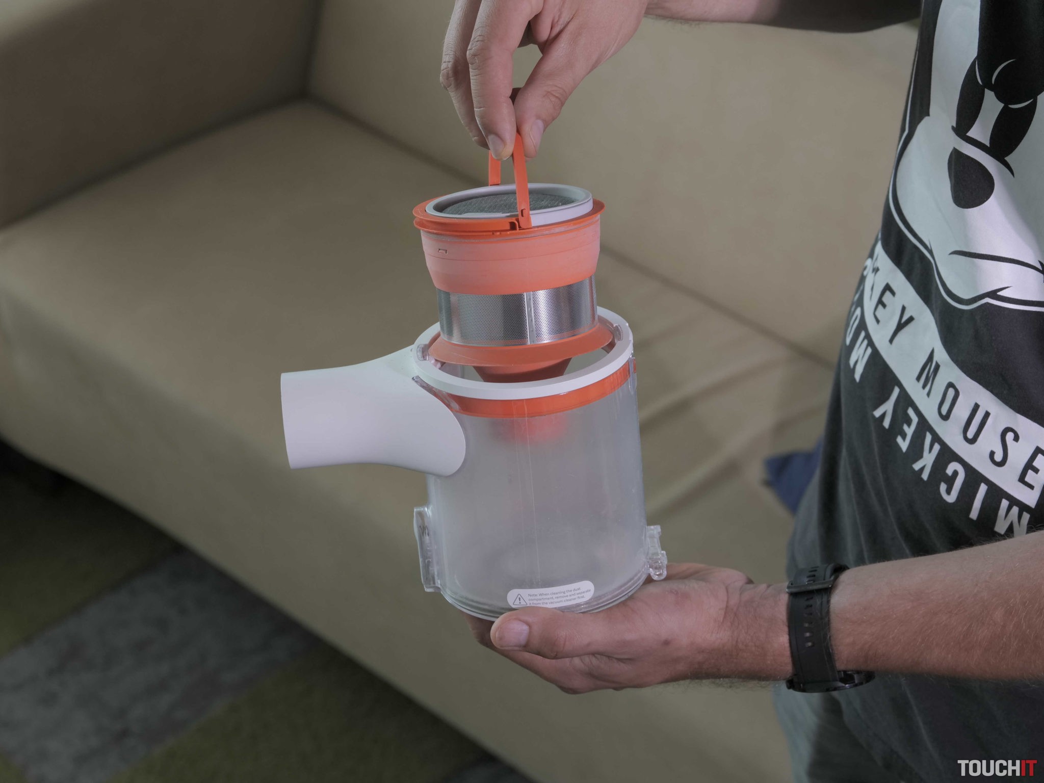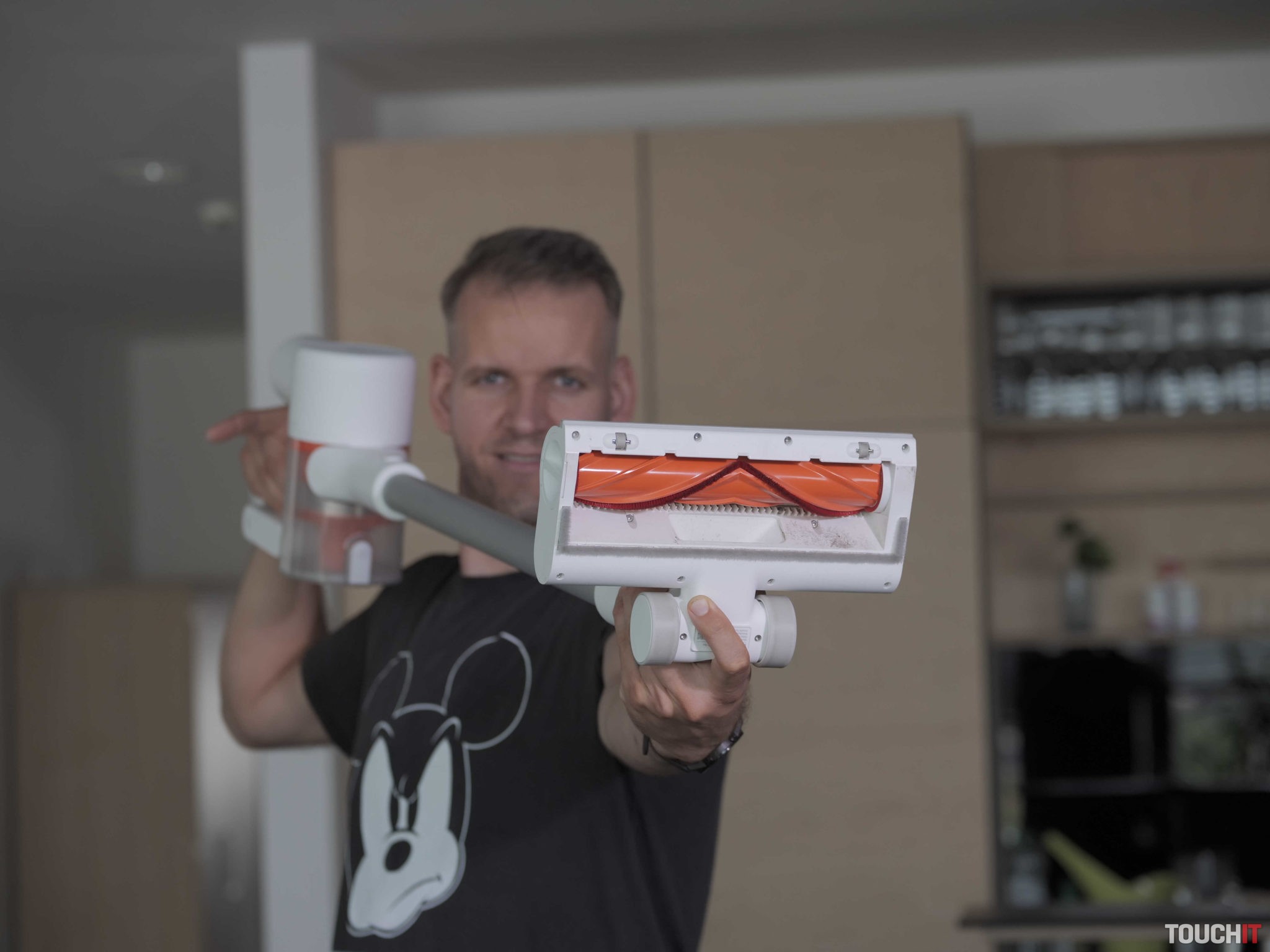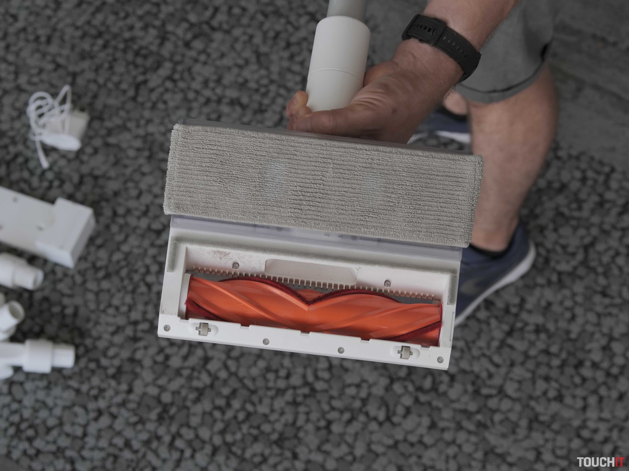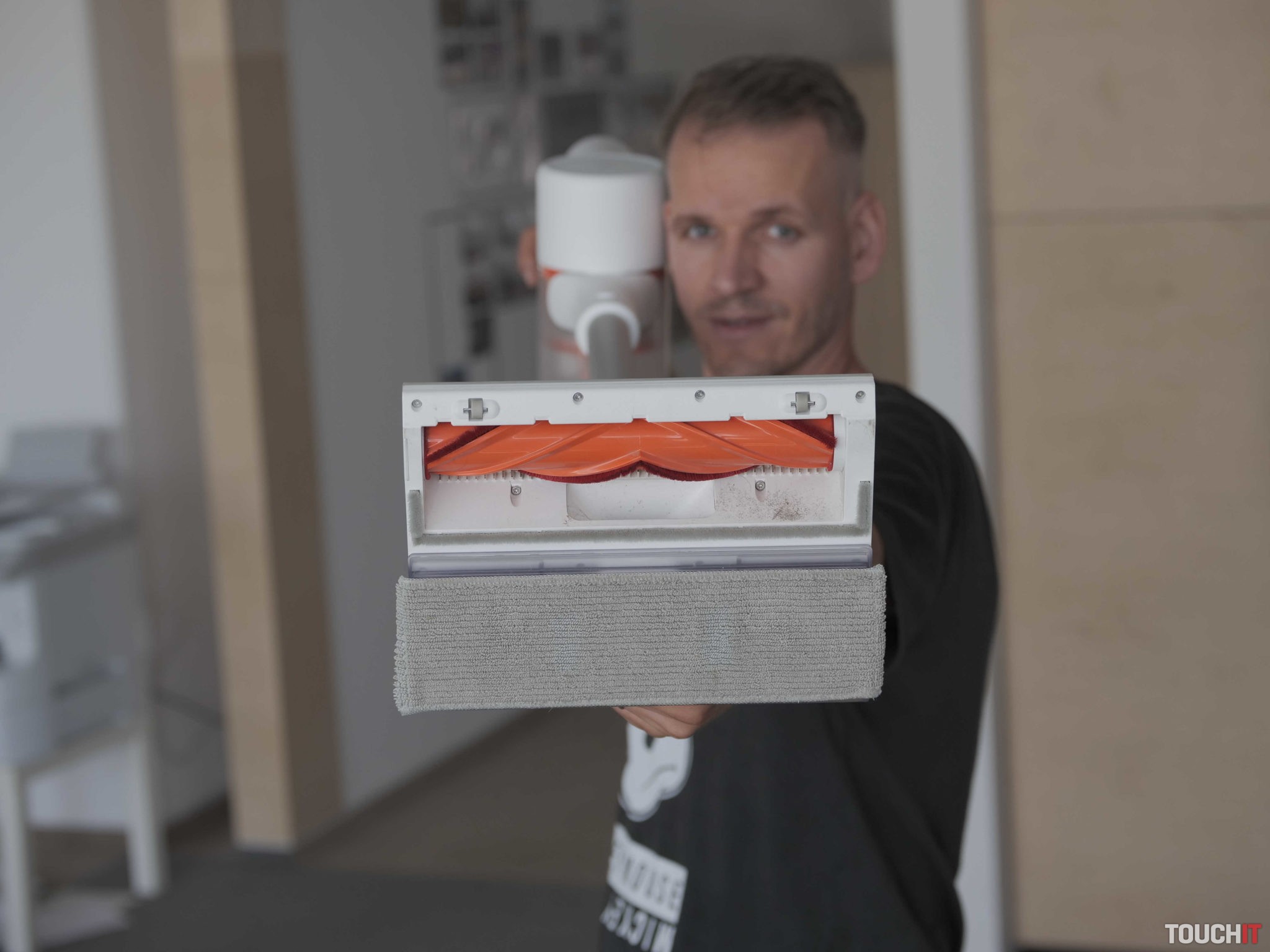 Špecialitou tohto vysávača je aj mopovací nadstavec. Funguje tak, že do neho napustíte čistú vodu a zo spodnej časti nasadíte handričku z mikrovlákna. Nadstavec sa magneticky prichytí v spodnej časti hlavného čistiaceho nadstavca s rotačnou kefou. Umývanie funguje tak, že počas vysávania sa handrička priebežne navlhčuje a vytiera podlahu. Zázraky však od tohto umývania nečakajte. Nám sa voda nedistrubuovala rovnomerne a mopovanie považujeme iba ako príjemný doplnok, na dodatočné zotretie prachu. S odolnejšími škvrnami si mop neporadí.