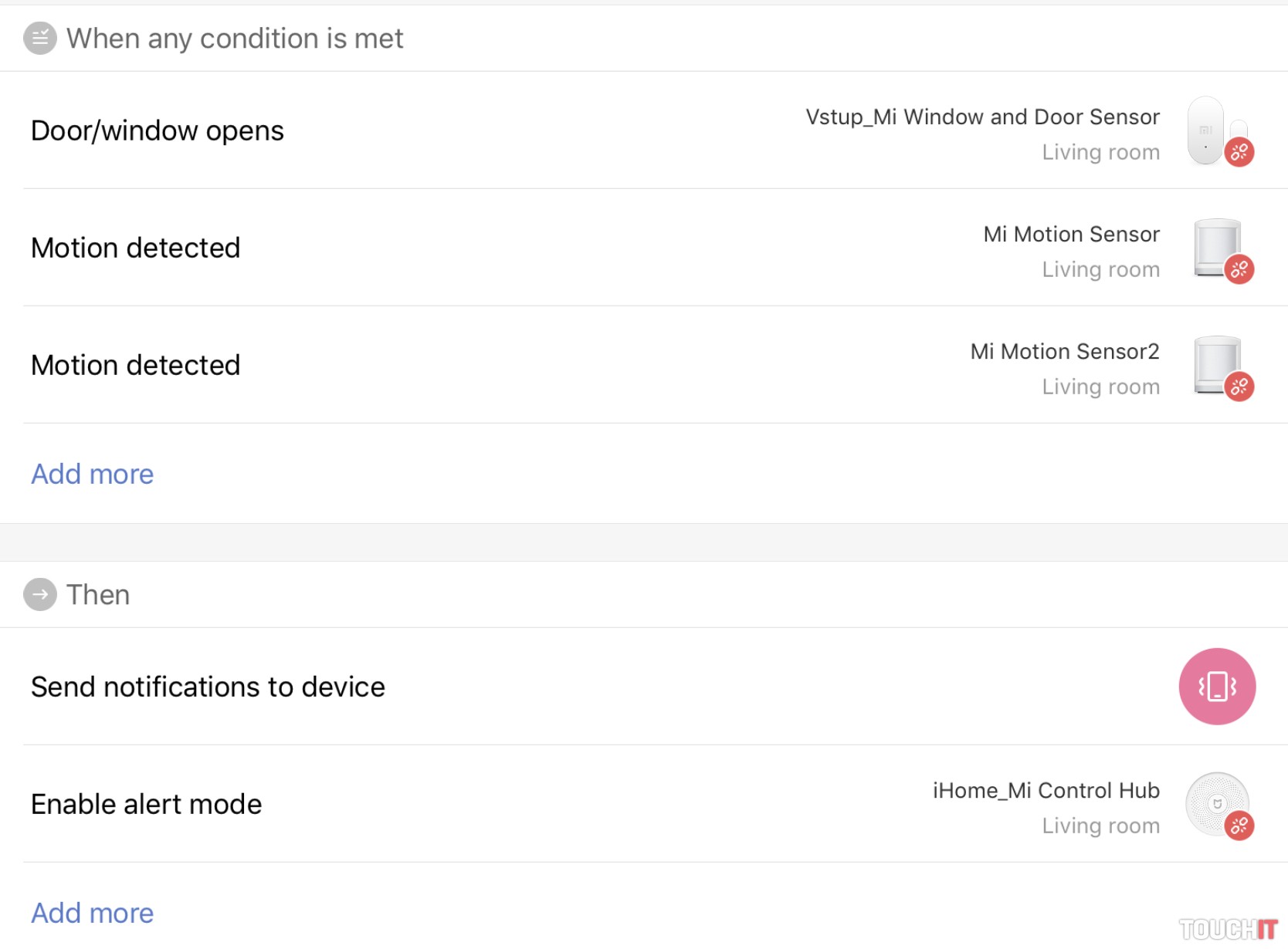 Ak jedno zariadenie spraví toto, tak ďalšie jedno/dve/tri spravia hento. Prvotných spúšťačov scény môže byť aj viac, napr. dverový, pohybový a okenný senzor, pričom si môžete nastaviť, či sa má scéna spustiť iba vtedy, ak sú splnené všetky podmienky, teda všetky 3 senzory zistia narušenie alebo stačí, ak zistí narušenie iba jeden spúšťač, napr. okenný senzor. To je výborná funkcia. Okrem dvoch základných podmienok – „na základe tohoto, sprav toto“, môžete pridať aj ďalšiu, strednú, podmienku („na základe tohoto alebo tamtoho, sprav toto a tamto“) spustenia, ako je uvedené vyššie. Plus nechýba ani podrobný časový harmonogram spúšťania, opakovanie v dané dni, oneskorenie spustenia a pod. V Praxi to môže vyzerať takto – u nás!