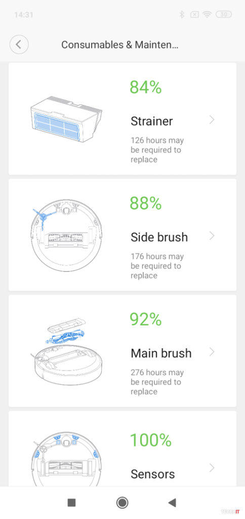 Samozrejmosťou je možnosť nastavenia pravidelného čistenia v dané dni a časy. Nastaviť môžete opakovanie, čas spustenia a režim výkonu. Napr. cez víkend ráno max. výkon a cez týždeň každé doobeda štandardný výkon. V nastaveniach vidíte aj to, kedy a koľko vysávač pracoval, či ukončil čistenie samostatne alebo príkazom používateľa. Občas padne aj takáto informácia vhod. Praktickým doplnkom sú informácie, resp. odporúčania na vyčistenie alebo výmenu jednotlivých spotrebných častí – v tejto sekcii sú zobrazené všetky podstatné diely a percento ich „životnosti“, po ktorej ich treba vymeniť alebo vyčistiť. Následne stačí výmenu/čistenie potvrdiť a počítanie sa začne odznovu. Užitočná funkcia.