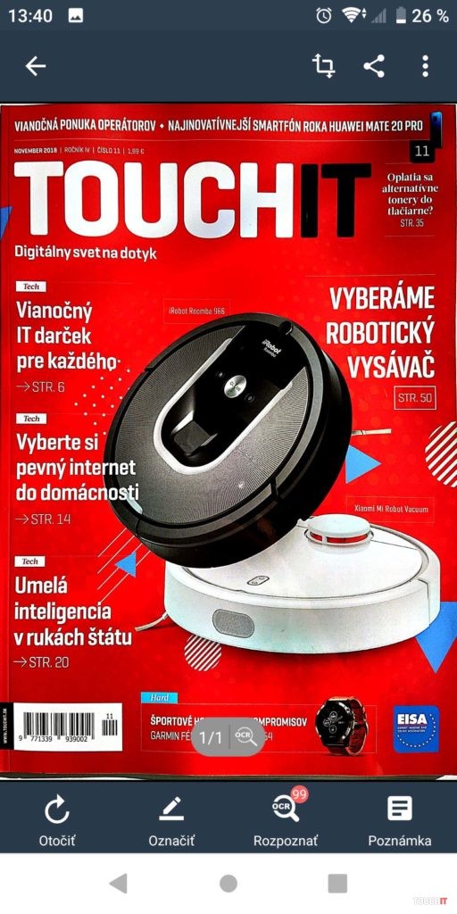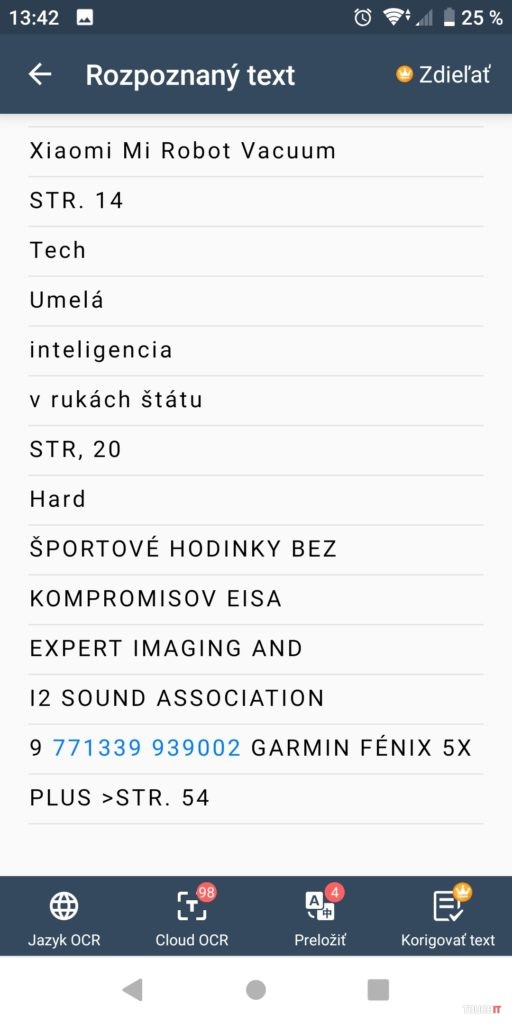 Po potvrdení orezových strán sa dokument presne vyrovná a upraví tak, akoby bol vyhotovený klasickým skenerom. Deformácie nie sú viditeľné. Pokiaľ nie ste spokojní, ako dokument vyzerá, prípadne chcete na ňom zvýrazniť text, tak na tento účel sa dajú použiť rôzne filtre priamo v aplikácii.V prípade potreby sa dajú vyhotovené skeny zdieľať vo forme PDF, obrázka JPG, odkazu alebo OCR. V neposlednom rade, sa dá požadovaný súbor poslať po sieti, priamo do podporovanej tlačiarne. V prípade funkcie OCR ide o vyňatie textu zo súboru a ten je následne prevedený na klasický text. V našom prípade sme vyskúšali aplikáciu na členitej obálke nášho magazínu, z ktorej bol text bol vyňatý bez zaváhania. (ukážka nižšie)Šikovná funkcia OCR vyberie z fotografie text, ktorý jej možné priamo v aplikácii preložiť