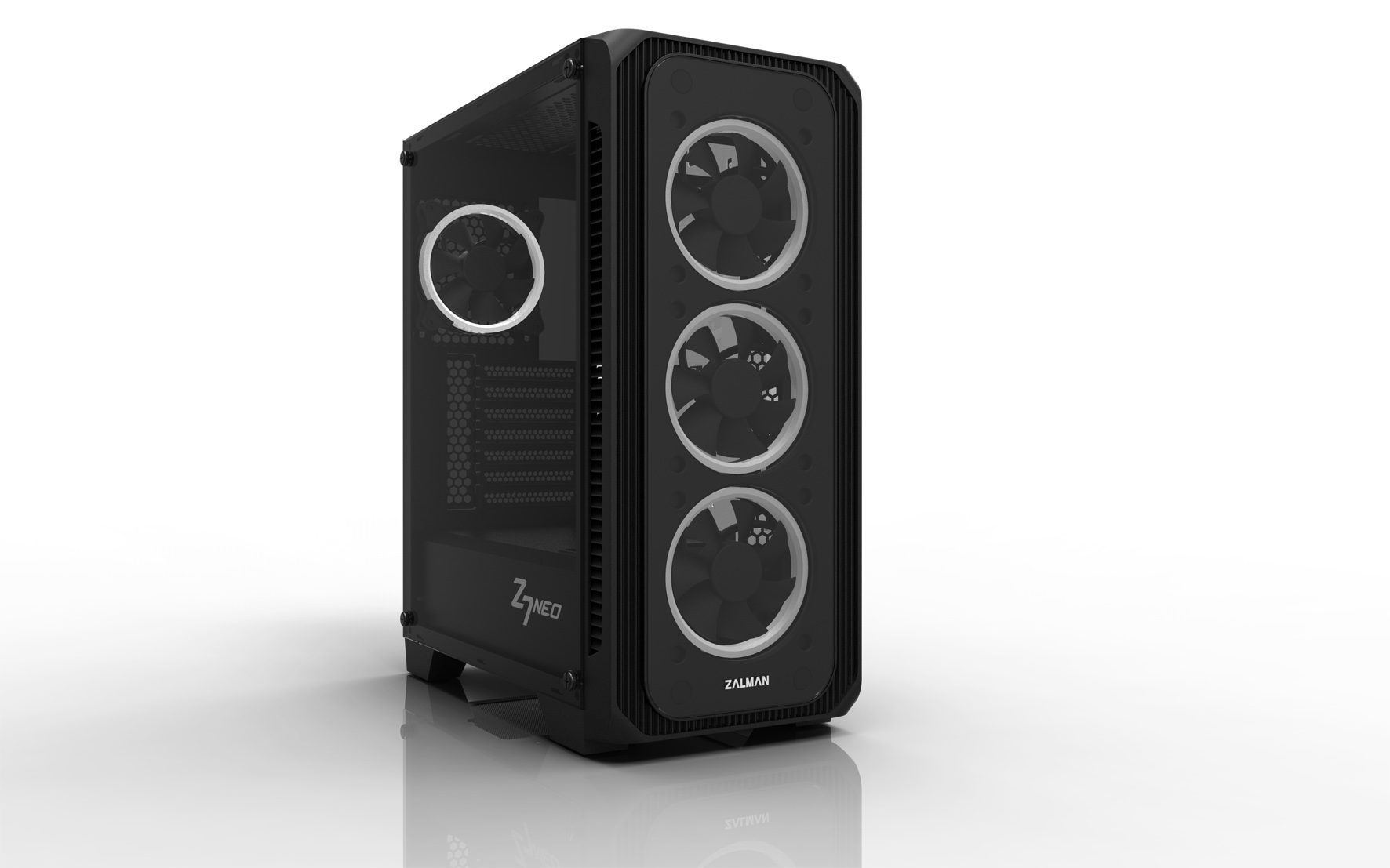 Vysoká kvalita vyhotovenia a použitých materiálov, predný a bočný priehľadný panel z tvrdeného skla o sile 4T, povrchová úprava v atraktívnej čiernej farbe a štyri 120 mm predinštalované ventilátory s efektným kruhovým RGB LED podsvietením nenechajú nikoho na pochybách, že majú pred sebou jeden z top produktov značky Zalman.