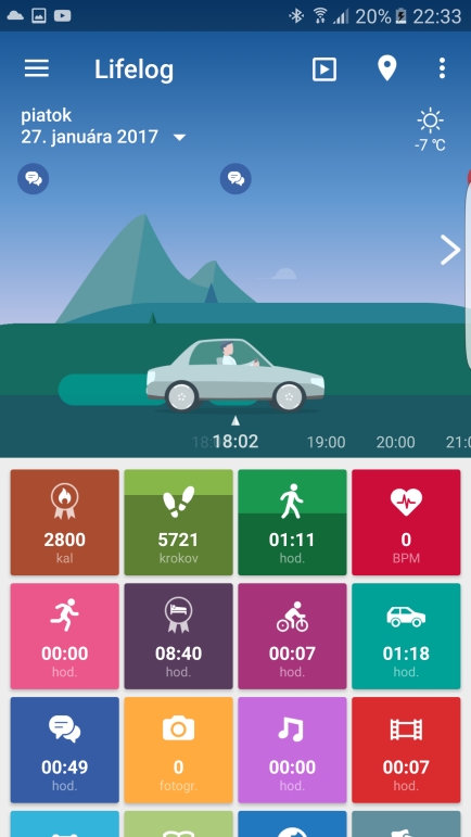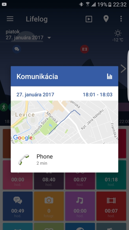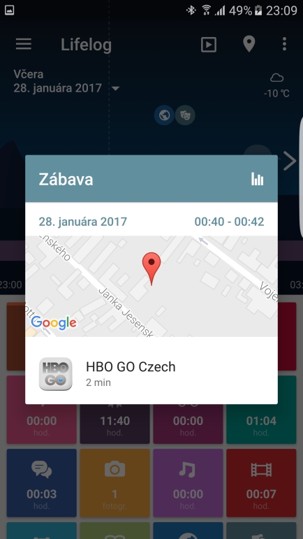 Základné rozhranie aplikácie Lifelog, detail komunikácie, pohybu v aute a sledovania v aplikácii HBO GO Je celkom pochopiteľné, že aplikácia neexistuje pre iOS prostredie, lebo pristupuje k naozaj dosť veľa zdrojom v telefóne. Na druhej strane, na Androide všetko pripraví do efektnej podoby a keď si potrebujete spomenúť, čo ste robili, kde ste boli, tak aplikácia Lifelog je na to účinná pomoc. Sami sme ju tak používali.Niečo vie presne a niečo odhadne