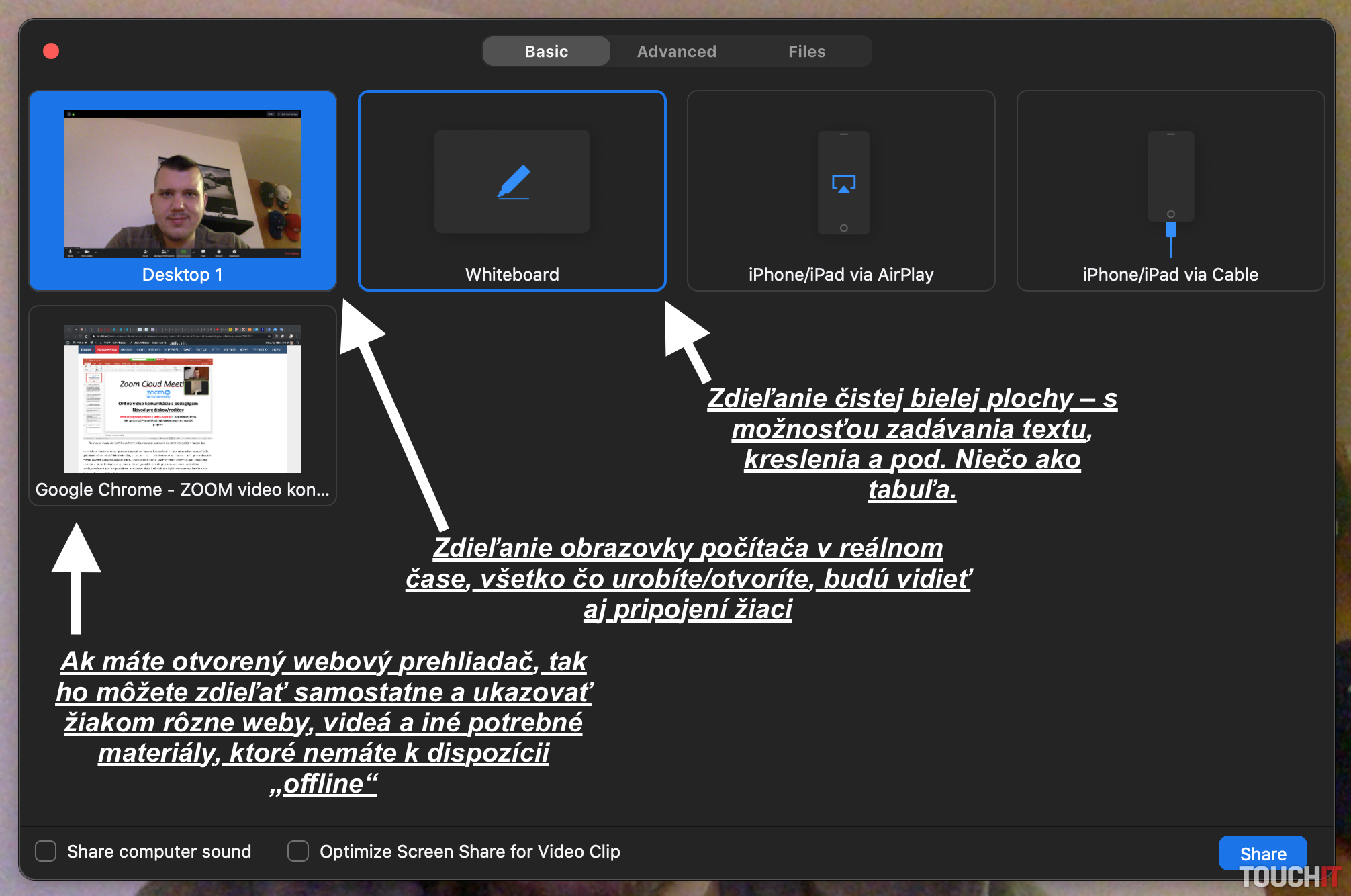 Okrem toho, že žiakov vidíte a počujete, ako aj oni vás, tak im môžete v reálnom čase zdieľať rôzne prezentácie, články a pod. priamo z vášho počítača. V strede dole kliknite na položku „Share Screen“ a následne vyberte, čo chcete so žiakmi zdieľať. Ak máte v samostatnom okne otvorenú nejakú prezentáciu, prípadne článok, rozpracované učivo a pod., tak naňho dvakrát kliknite, pričom ho na svojich obrazovkách okamžite uvidia aj vaši žiaci.