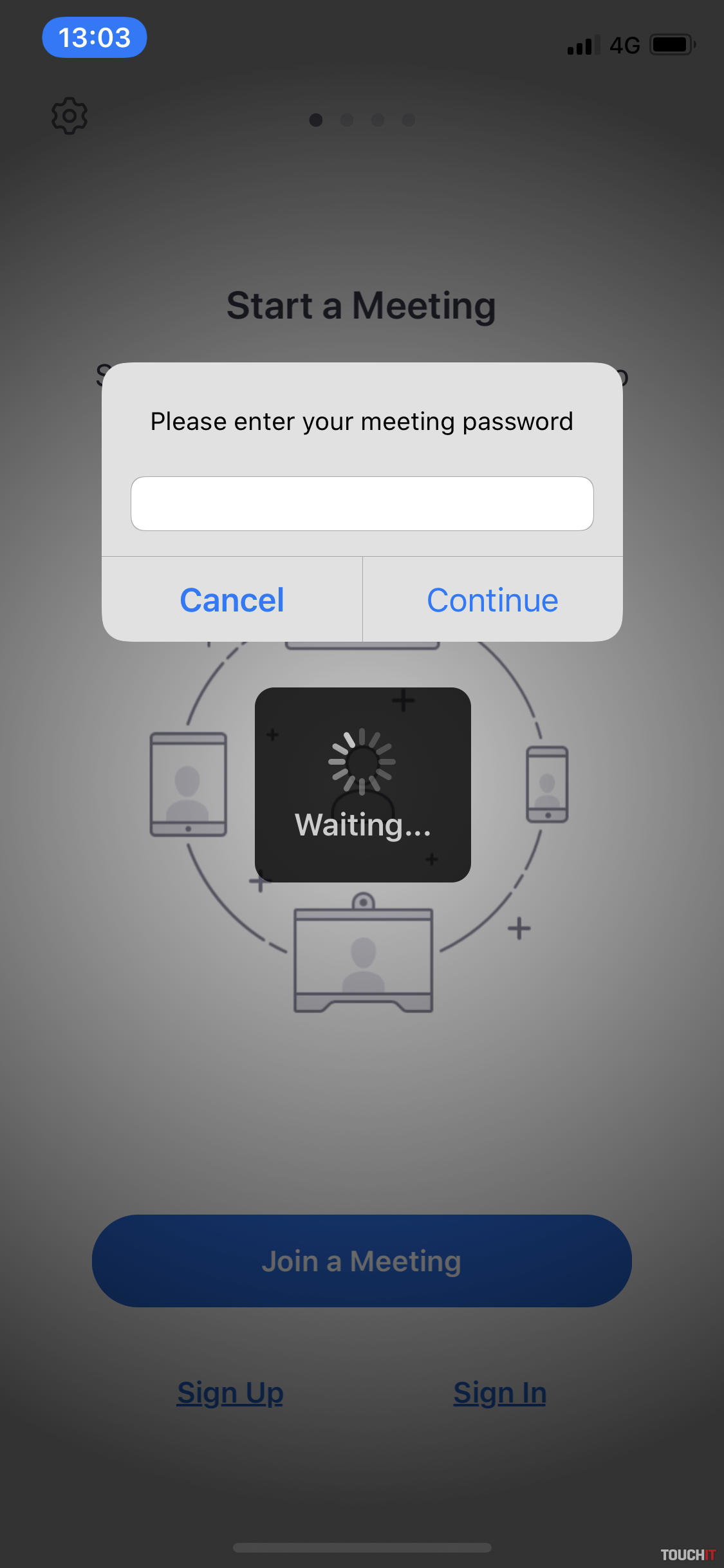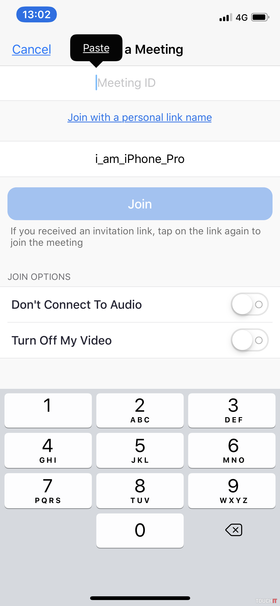 - Otvorte aplikáciu, pričom sa vám ako prvá zobrazí plocha s modrým rámikom – JOIN a MEETING – kliknite na túto položku a do kolonky Meeting ID zadajte číslo „miestnosti“, ktoré vám pošle pedagóg. V kolonke pod tým bude automaticky zobrazené vaše meno alebo meno telefónu – toto môžete/nemusíte meniť.